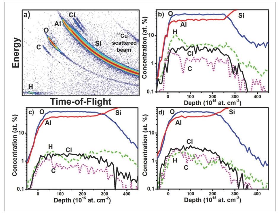 圖3:在ToF-ERDA測量中,可以通過測量每個反沖原子的飛行時間和能量來分離不同的質量。Al2O3膜的元素深度分布:b)用7秒臭氧脈沖時間沉積時,c)用20秒臭氧脈沖LT+HT處理后,以及d)用7 s臭氧脈沖LT+T處理后。a) 與(c)中的深度剖面相對應的直方圖。該膜在200°C下以400次ALD循環沉積。注:由于直方圖中Al和Si在Si/Al2O3界面處的截面重疊,因此將Al和Si的深度分布繪制為一體。