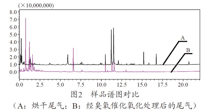 江蘇XX 醫(yī)藥生產(chǎn)企業(yè),烘干尾氣,即使經(jīng)過三級(jí)堿噴淋,仍然惡臭異味明顯。應(yīng)用臭氧催化氧化技術(shù)的小試裝置,進(jìn)行現(xiàn)場實(shí)驗(yàn),實(shí)驗(yàn)結(jié)果如圖2。異味去除明顯,在實(shí)驗(yàn)裝置的排放口基本嗅不到異味,經(jīng)三方檢測,惡臭無量綱數(shù)值小于300。