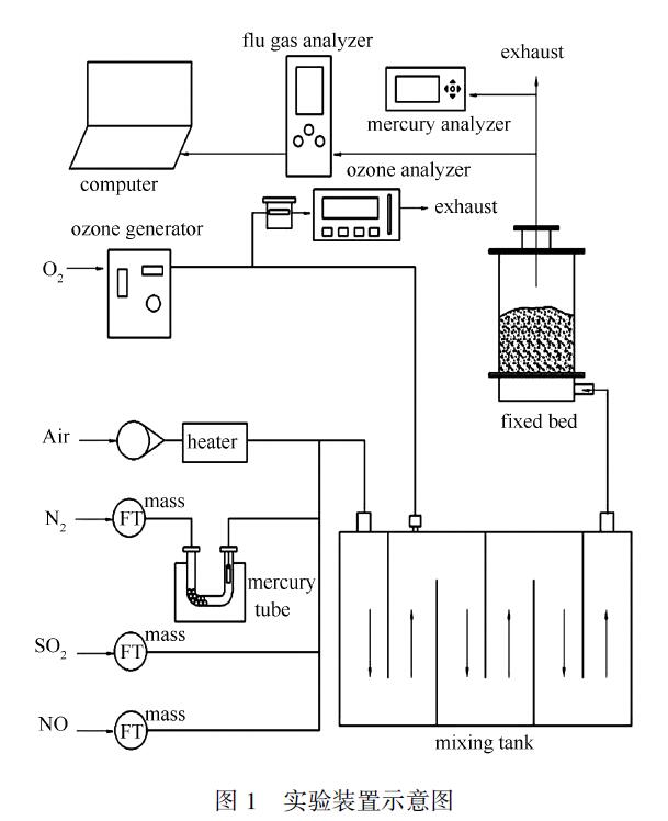 實驗系統示意圖見圖1,主要由配氣系統、氣體混合罐、吸附床和檢測系統組成。配氣系統:空壓機壓縮鼓出的空氣通過轉子流量計控制,使用管式爐進行預熱調溫,使用質量流量控制器控制N2、NO 和SO2 氣體,其中,N2 氣體用于吹脫汞管中汞蒸氣。使用溫度測試儀測定煙氣溫度。O2與臭氧發生器相連,產生一定濃度的臭氧氣體,通過其自帶的流量計控制流量并注入混合罐中與煙氣混合。