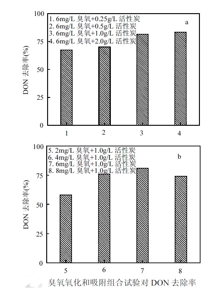 3.在臭氧氧化和活性炭吸附組合試驗(yàn)中,DON 的去除率 很大可達(dá) 83.3%;臭氧投加量固定(6.0mg/L),隨活性炭投加量增加(從0.25g/L增加到2.0g/L),協(xié)同因子從1.15到1.09,表明此時(shí)臭氧/活性炭體系中存在著明顯的協(xié)同效應(yīng);當(dāng)活性炭投加量固定(1.0g/L),臭氧投加量為2,4,6mg/L,協(xié)同因子分別為1.12、1.07 和1.10,臭氧/活性炭體系中也存在著一定程度的協(xié)同效應(yīng),臭氧投加量為8mg/L時(shí),協(xié)同因子為0.97,系統(tǒng)無明顯協(xié)同作用.