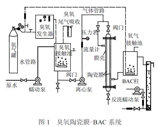 膜工藝在飲用水處理中的應(yīng)用日益增多,其對水中顆粒物有很好的分離能力,膜出水濁度一般在0.2NTU 以下,在水處理中有很大的應(yīng)用潛力.但實踐證明,膜的污染和膜工藝無法有效去除溶解性有機物和氨氮,阻礙了其廣泛應(yīng)用.陶瓷膜具有機械強度高、化學(xué)穩(wěn)定性和熱穩(wěn)定性高等優(yōu)點.陶瓷膜能夠與臭氧直接接觸,可有效控制膜污染.臭氧氧化在控制膜污染的同時還能降低有機物的分子量,提高其可生化性.但有報道指出,臭氧氧化可降低膜對的有機物的去除效果.為提高膜對有機物的去除,通常在膜工藝前設(shè)置粉末活性炭或顆粒活性炭等預(yù)處理工藝.預(yù)處理工藝能夠改變水中顆粒物和有機物的賦存形態(tài),降低膜的有機物負荷,減輕膜污染,提高有機物的去除效果.但此類預(yù)處理工藝多利用了活性炭的吸附作用,且對氨氮的去除無顯著改善.研究表明,生物活性碳(BAC)可有效去除水中的有機物和氨氮.因此,在臭氧-陶瓷膜后設(shè)置BAC工藝,形成臭氧陶瓷膜-BAC組合工藝,可在臭氧控制膜污染的基礎(chǔ)上去除有機物和氨氮,能夠一舉兩得.