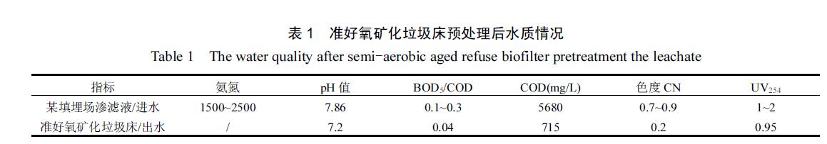 垃圾滲濾液取自中國西部某大型傳統厭氧型填埋場,運營時間為20a,其垃圾滲濾液呈深褐,水質偏堿性,pH值為7.86,COD為5680mg/L.實驗所用廢水經準好氧礦化垃圾床處理,準好氧礦化垃圾床裝置已被多次報道[11],其對氨氮有十分優異的去除性能.滲濾液尾水呈淺棕色,pH 值為7.2,COD 為715mg/L,由于準好氧礦化垃圾床的微生物作用使得滲濾液尾水的可生化性極差,其水質特征如表1所示.