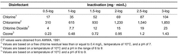 原生動物隱孢子蟲很難被氯和氯胺滅活。對于1-log失活(= 90%失活),氯失活的Ct值在3000和4000mg min / L之間變化。兩個表都來自環境保護局(EPA)。