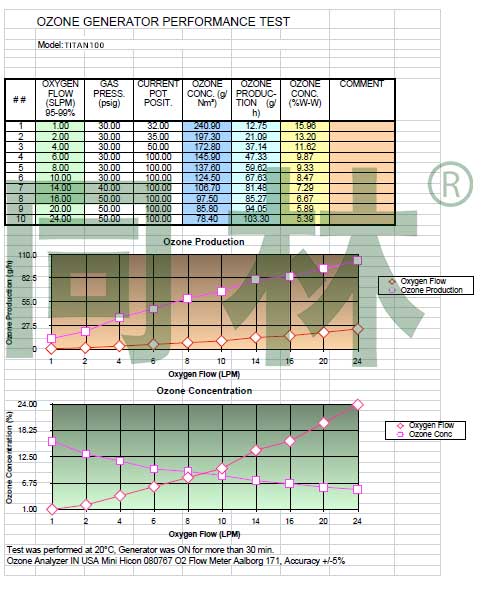 TITAN 100臭氧發生器是一種極其高效的風冷式臭氧發生器。僅 24 LPM 氧氣即可產生 100 克/小時的臭氧。